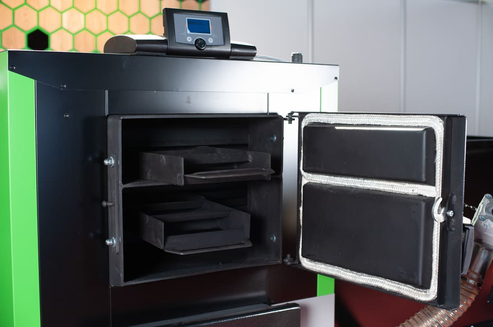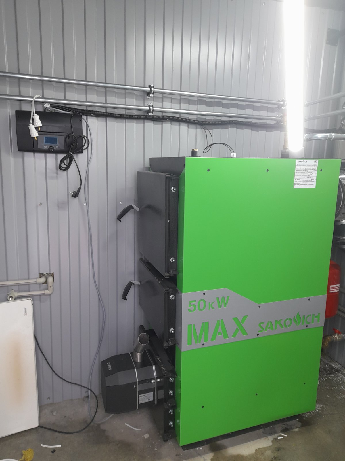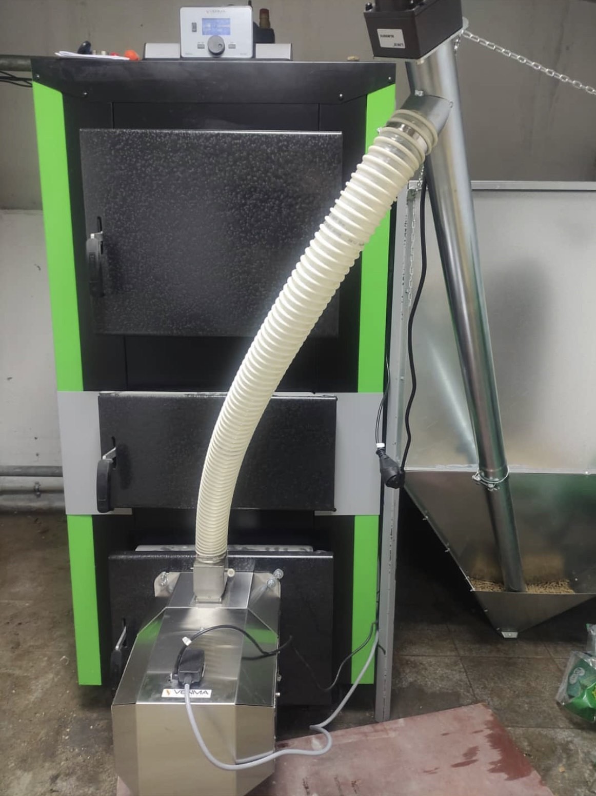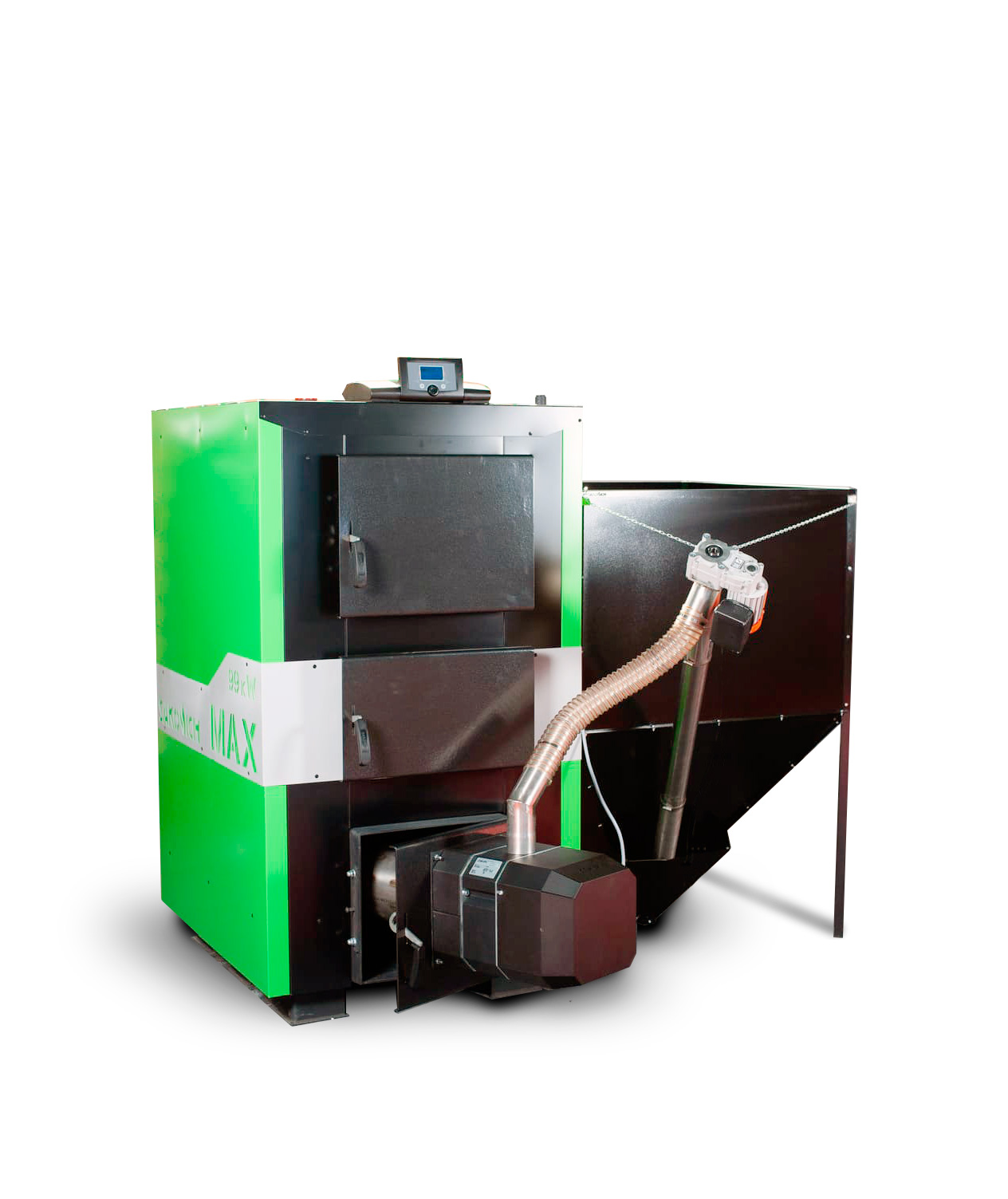 Контроллеры и вентиляторы, монтажный фланец для горелки, бункер для пеллет большего объёма, регулятор тяги