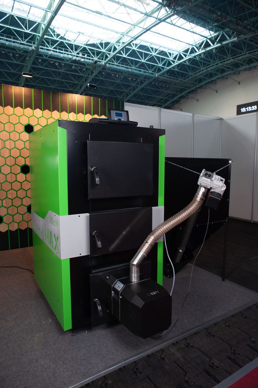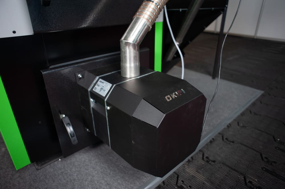 • ротационной пеллетной горелкой KIPI с автоматической очисткой для сжигания древесных гранул-пеллет, а также агро-пеллет (например, пеллета из рапсовой соломы или шелухи подсолнечника) размером 6-8 мм в полностью автоматическом режиме;