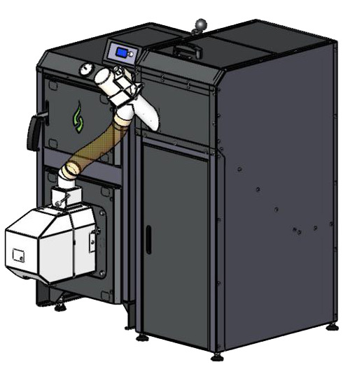 - опционально котел может комплектоваться пеллетной горелкой KIPI с автоматической очисткой для сжигания древесных гранул-пеллет, а также агро-пеллет (например, пеллета из рапсовой соломы или шелухи подсолнечника) размером 6-8 мм в полностью автоматическом режиме;