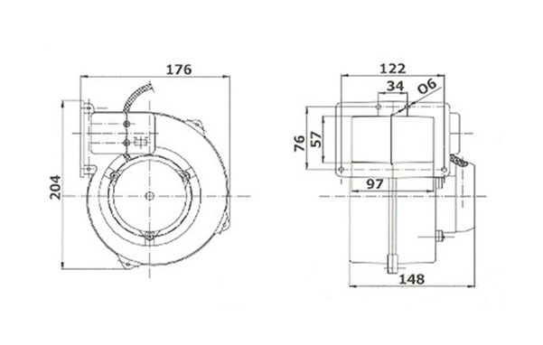Вентилятор состоит из 2-х частей: корпуса, в котором вмонтирован мотор, и крыльчатки. Входное для воздуха отверстие защищено сеткой. Отверстие для выхода воздуха имеет отверстия для крепления и кабель питания 3x0,75 mm2.
