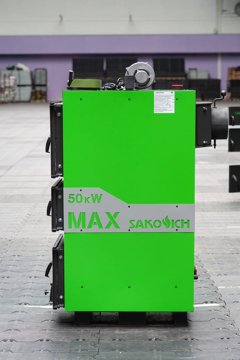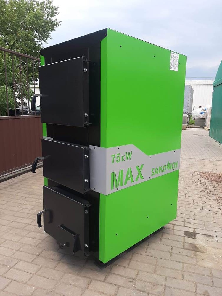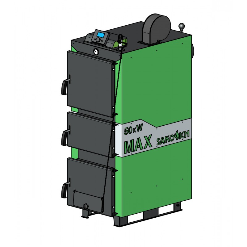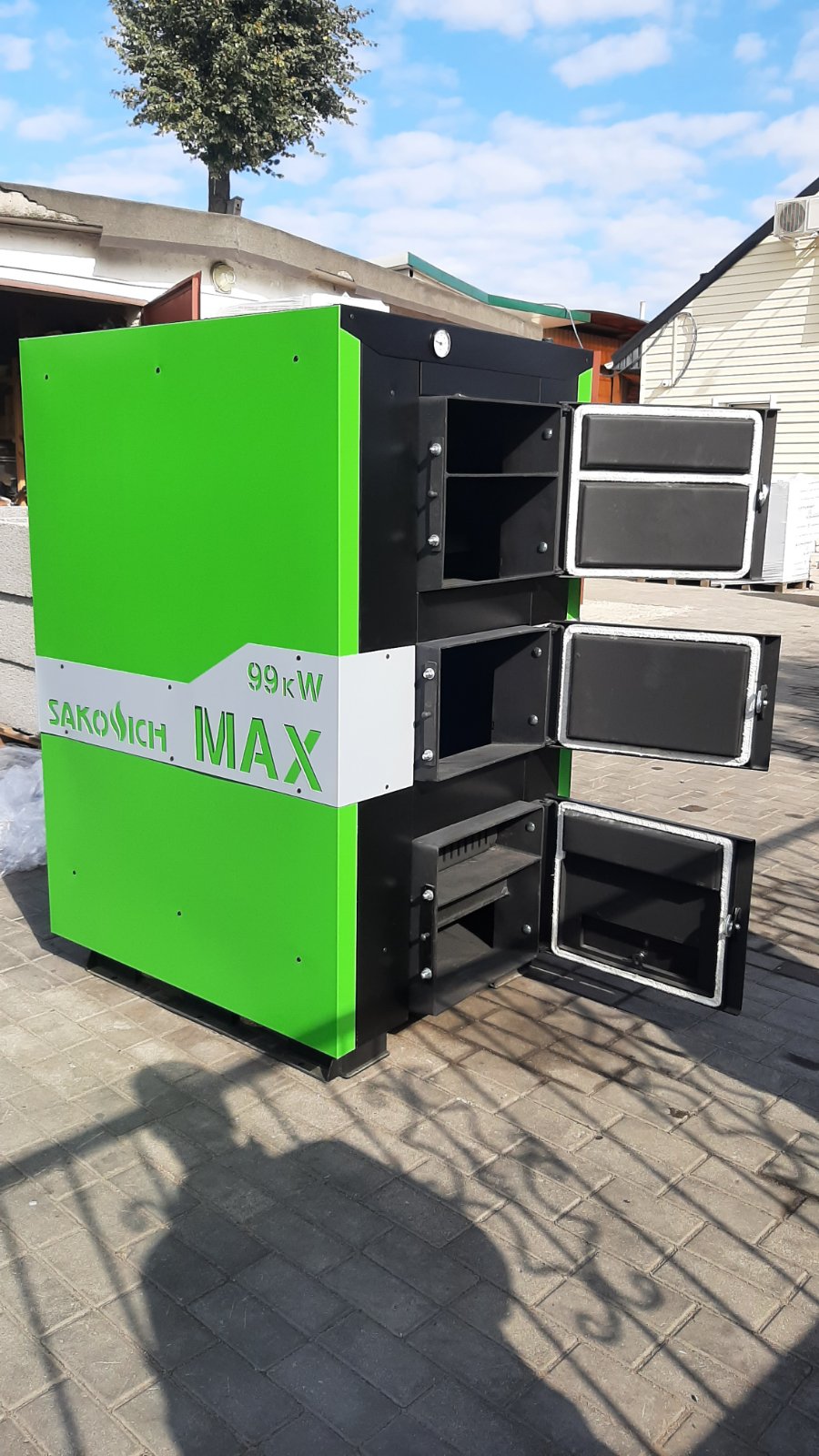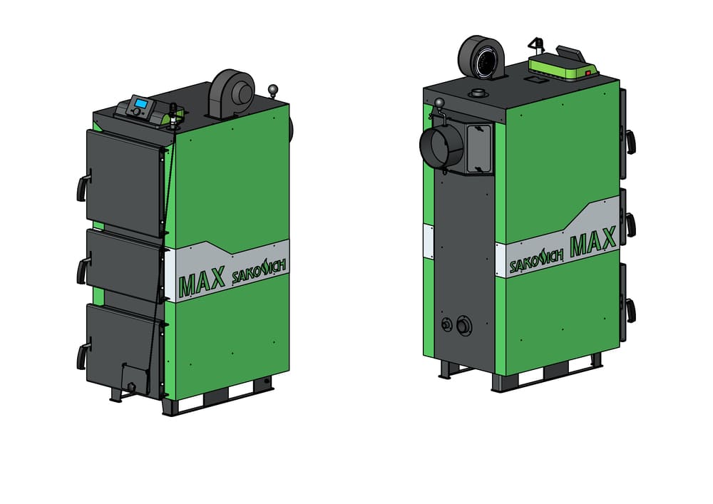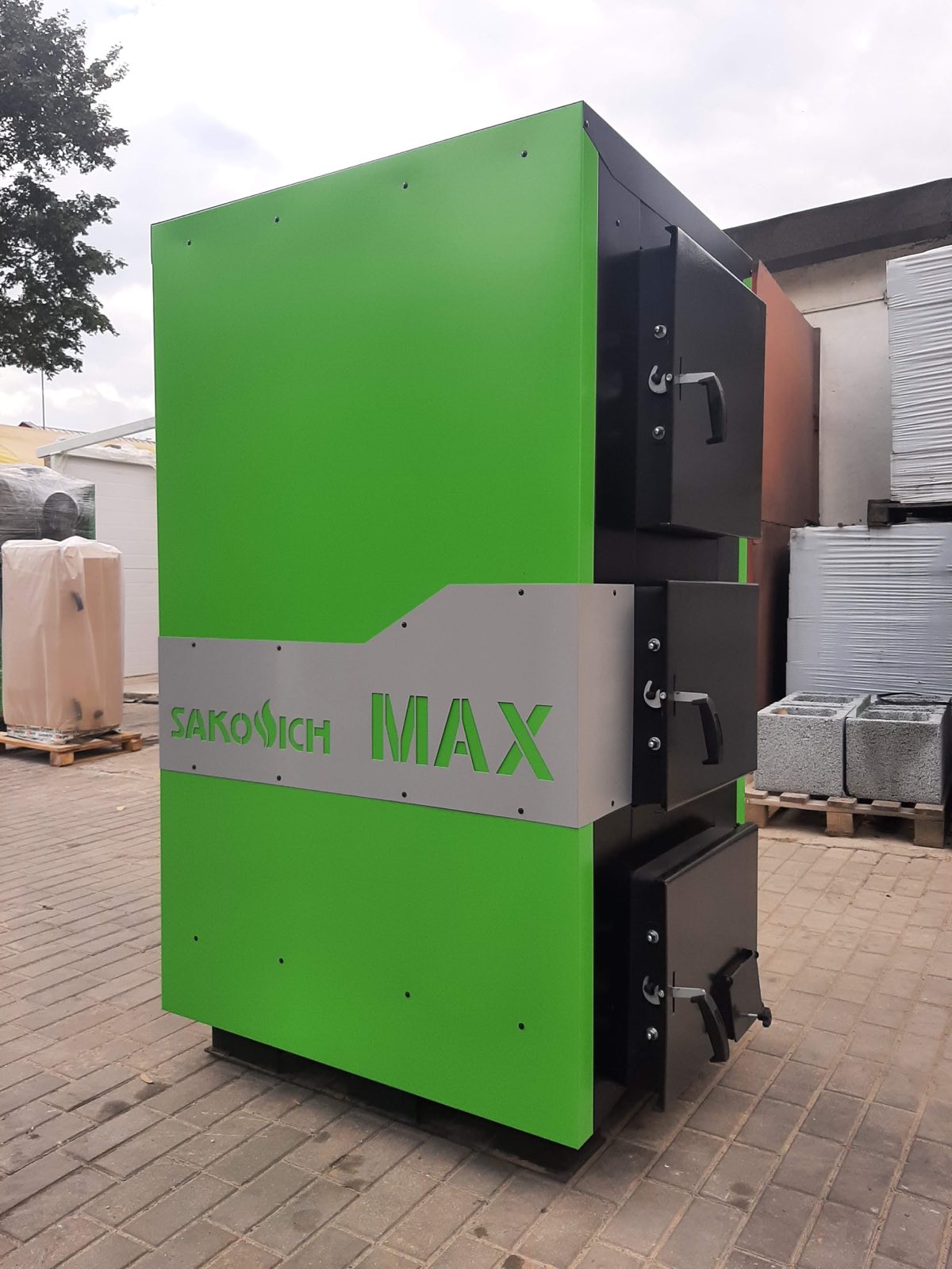 Теплообменник котла SAKOVICH MAX выполнен из котловой стали толщиной 6 мм с пятиходовым горизонтальным преломлением, изолирован минеральной ватой и обшит металлической облицовкой, окрашенной полимерной краской. Водонаполненные колосники выполнены из котловой стали толщиной 8 мм и внутренним сечением 20 см2, благодаря чему, в колосниках не происходит перегрев теплоносителя.