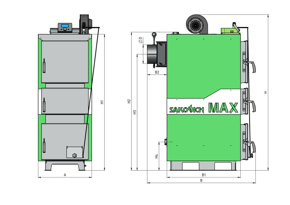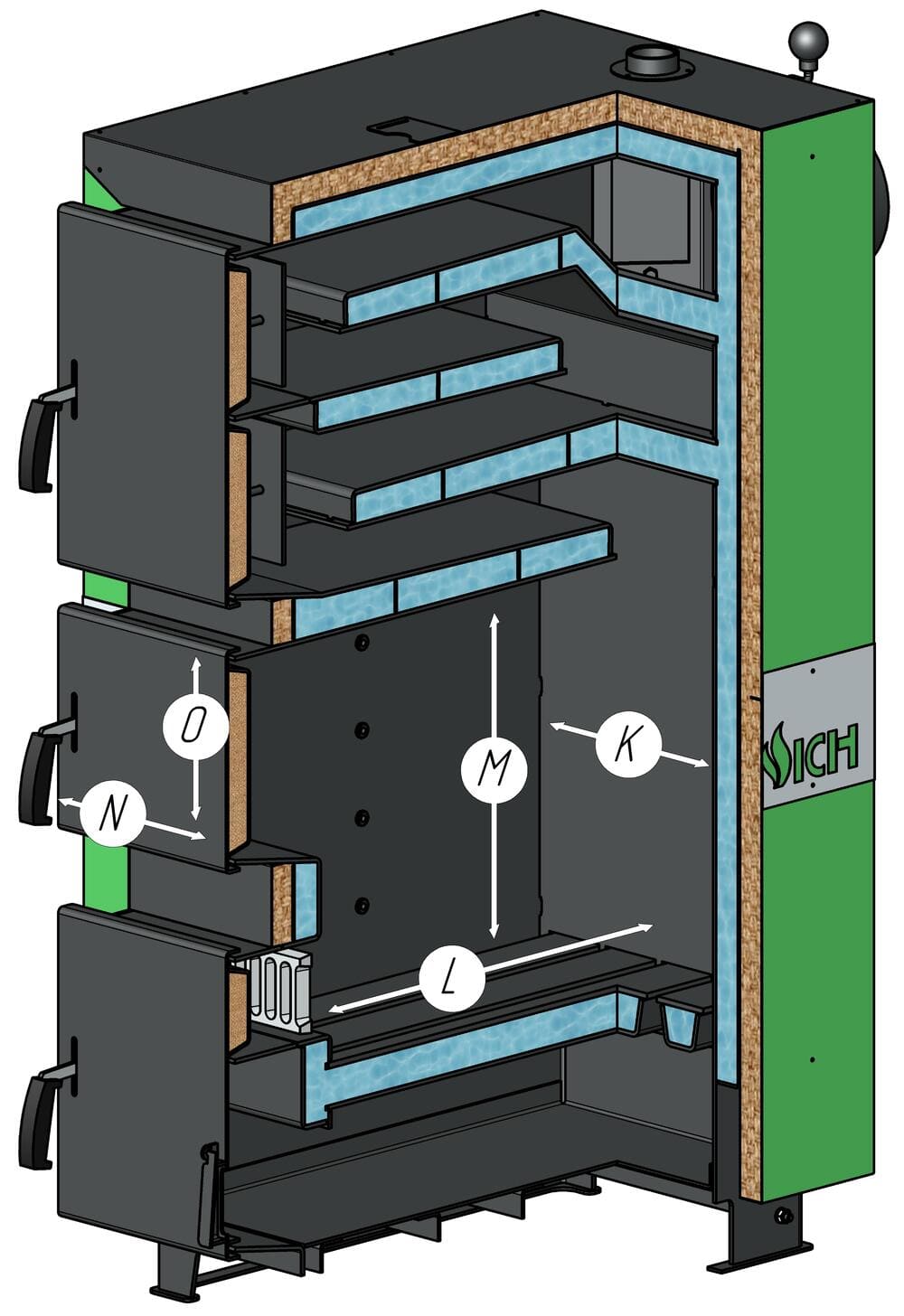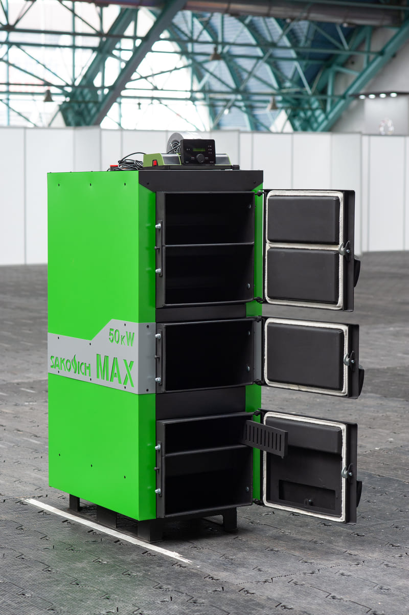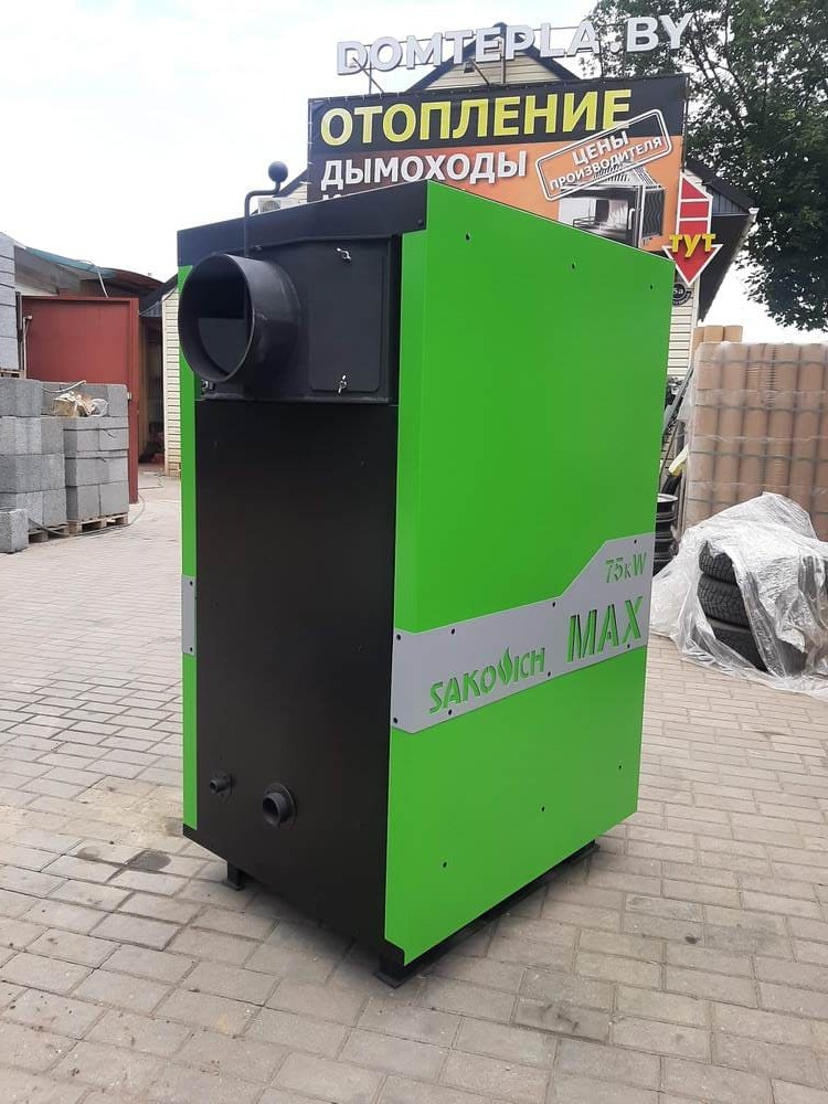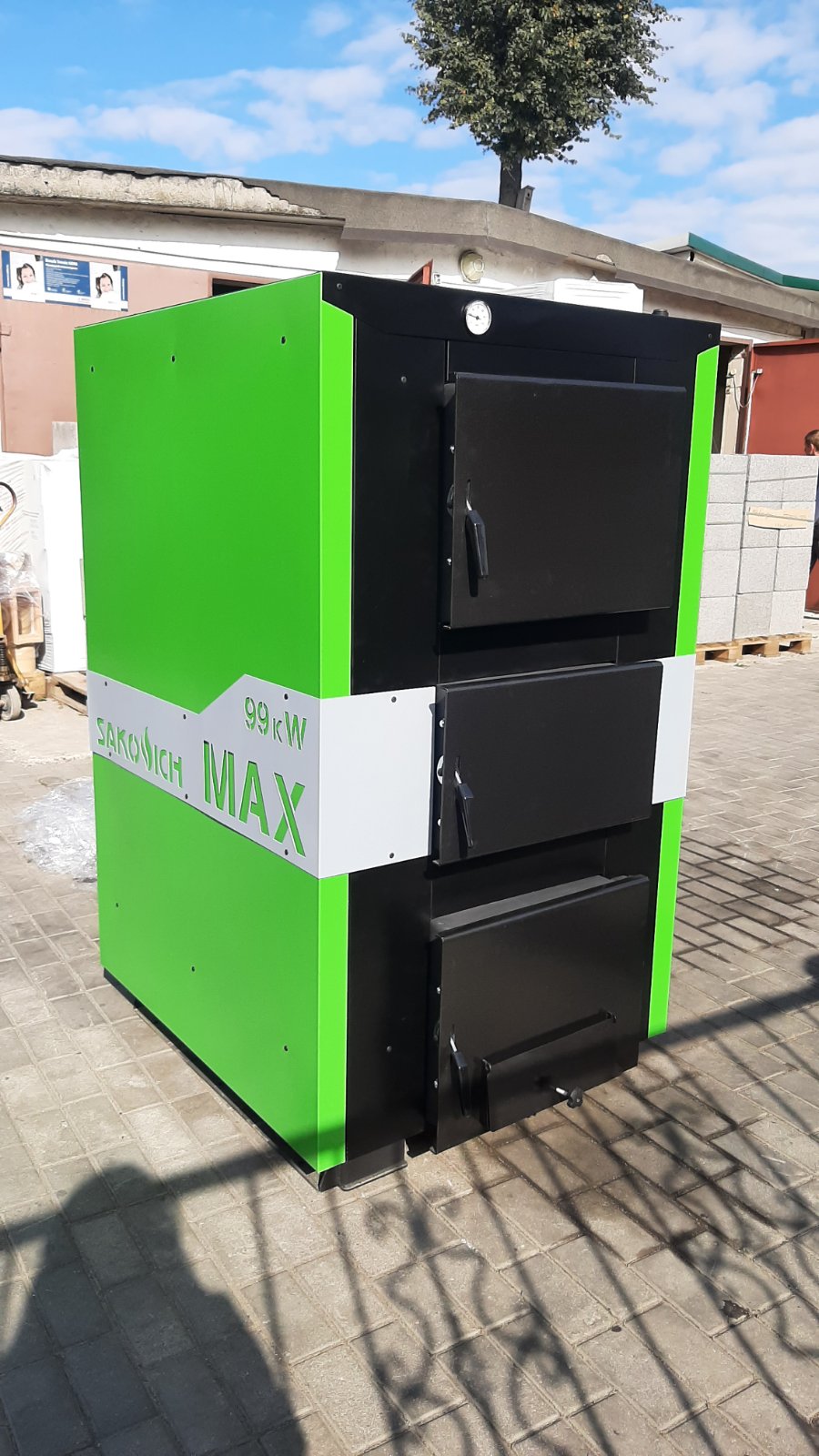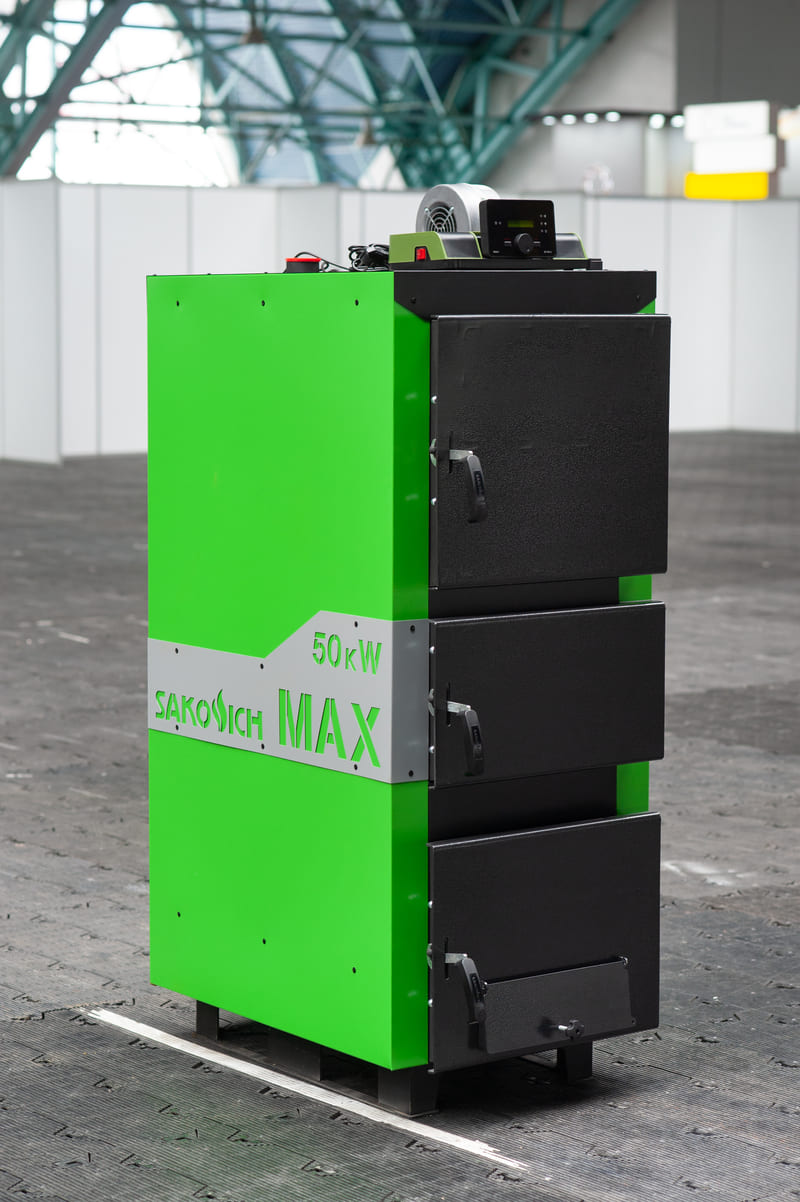 Теплообменник котла SAKOVICH MAX выполнен из котловой стали толщиной 6 мм с пятиходовым горизонтальным преломлением, изолирован минеральной ватой и обшит металлической облицовкой, окрашенной полимерной краской. Водонаполненные колосники выполнены из котловой стали толщиной 8 мм и внутренним сечением 20 см2, благодаря чему, в колосниках не происходит перегрев теплоносителя.